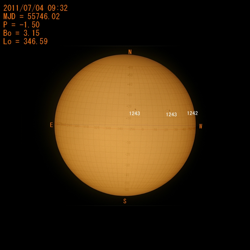 2011年07月01日の太陽(黒点1240西没、1242、1243、新黒点:曇)