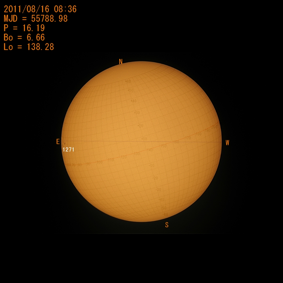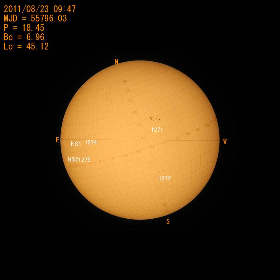 2011年08月27日の太陽(黒点1271、1272消滅、1274消滅、1275、1277、1278、1279、新黒点1280:曇)