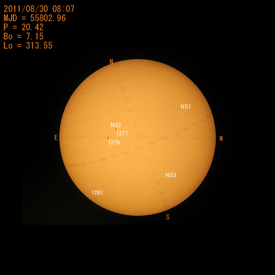 2011年08月30日の太陽(黒点1275、1277、1278消滅、1279、1280、1281:快晴)